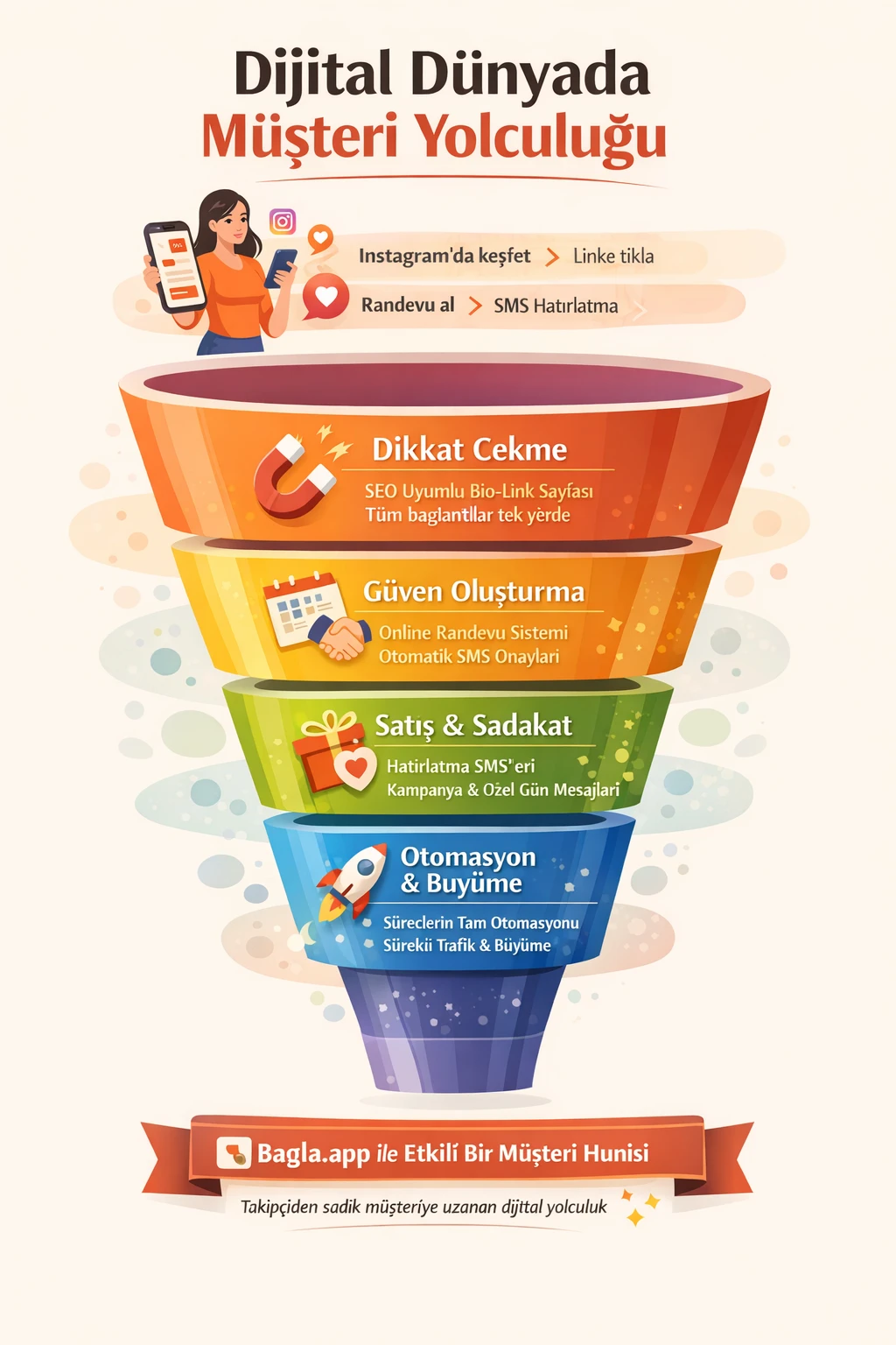 Bio-link sayfası, randevu yönetimi ve SMS bilgilendirme sistemiyle ilgi → güven → satış → sadakat aşamalarını tek çatı altında birleştirir.