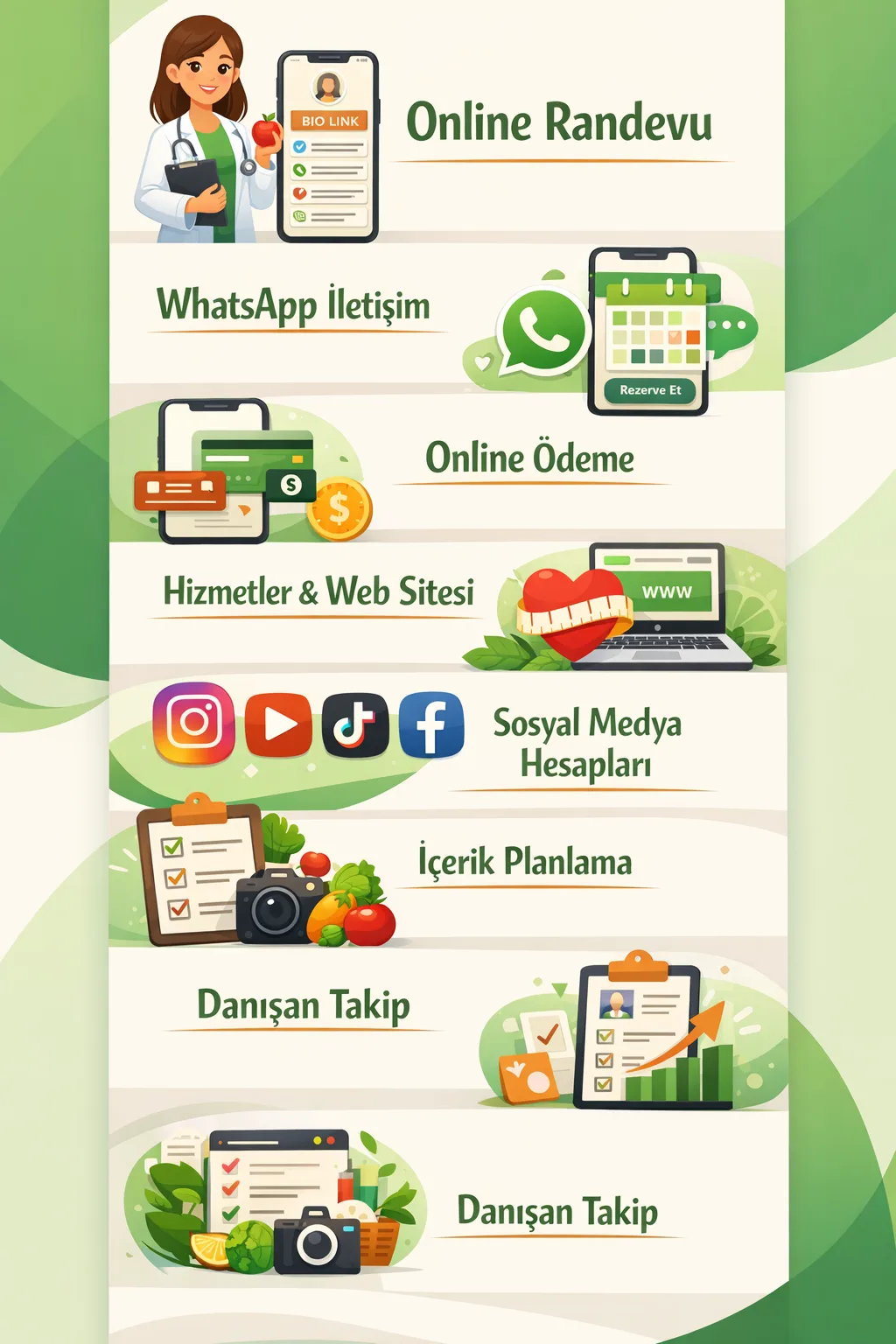 Bio link sayfaları, randevu sistemleri, WhatsApp iletişim bağlantıları ve online ödeme araçları sayesinde diyetisyenler Instagram üzerinden daha kolay danışan kazanabilir.