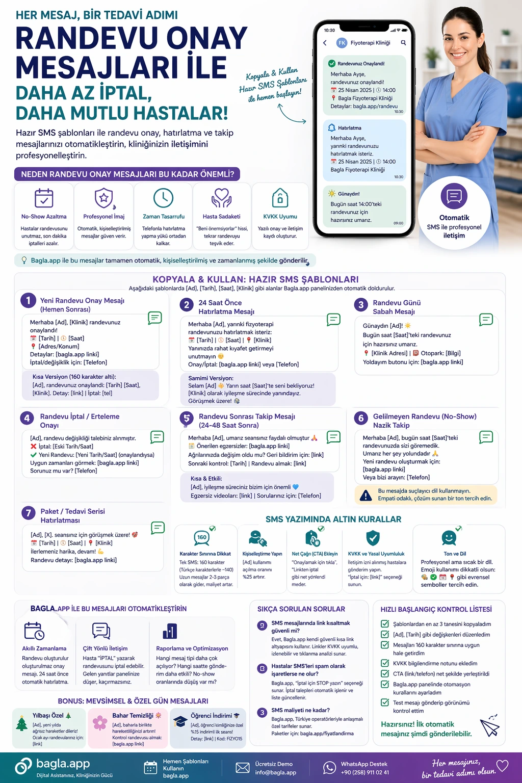 *Aşağıdaki şablonlarda `[Ad]`, `[Tarih]`, `[Saat]`, `[Klinik]` gibi alanları Bagla.app panelinizden otomatik doldurabilirsiniz.*